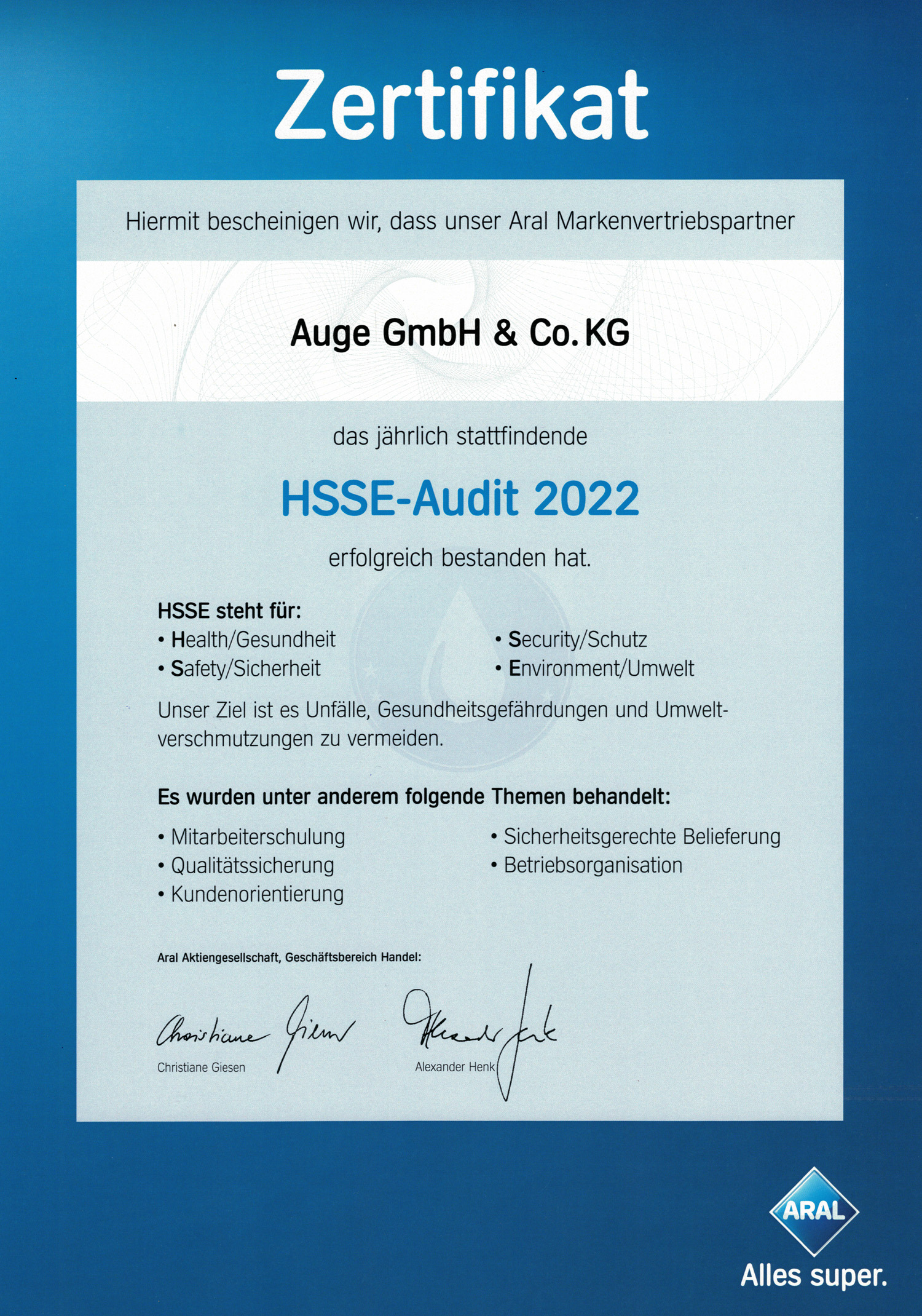 Um einen stets guten Service zu bieten arbeiten wir nach den höchsten Standards. Als Aral Markenvertriebspartner werden wir nach den aktuellen Anforderungen der Qualitätsmanagement Systeme regelmäßig geprüft. Unsere Mitarbeiter verfügen dabei über entsprechende Zertifizierungen, um eine maximale Sicherheit und Qualität zu gewährleisten.